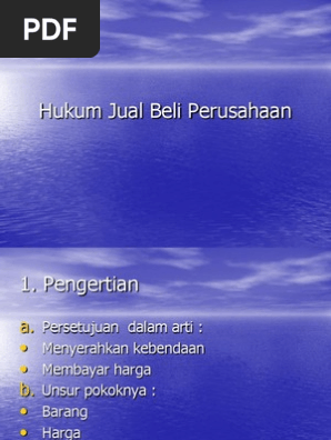 Makalah ini dibuat dalam rangka memenuhi tugas HUKUM DAGANG yang diberikan oleh dosen pengajar. Hukum dagang Jual Beli Perusahaan Pengertian jual beli perusahaan Buku III bab V KUHPerdata pasal 1457 menentukan jual beli adalah suatu persetujuan dimana para pihak penjual mengikatkan diri untuk menyerahkan suatu benda dan pihak yang lainpembeli mengikatkan diri untuk membayar harga benda sebagai yang sudah diperjanjikan. Aktivitas jual beli merupakan hal umum yang kita lihat dalam kehidupan sehari-hari.